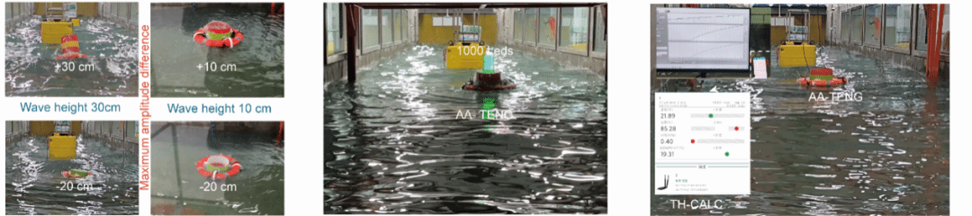 基于AA-TENG的结构设计的特殊性,其也为海洋自驱动传感系统、海上分布式监测节点、环境检测设备以及微功耗电子器件供能提供了重要参考,如图2所示。为了充分验证其结构在实际海洋环境中应用的可行性,该研究在模拟波浪环境下进行了实验测试,如图3所示,在0.1m的波高下,AA-TENG的有效振幅达到了30cm,当波高提升为0.3m时,其有效振幅达到了50cm。并且其在工作状态下能够点亮1000个LED灯和为温湿度进行供电运行,这些实验都充分的说明AA-TENG有望推动在流固耦合领域对可持续能量收集的研究,从而促进自构建的海洋微电网的发展。