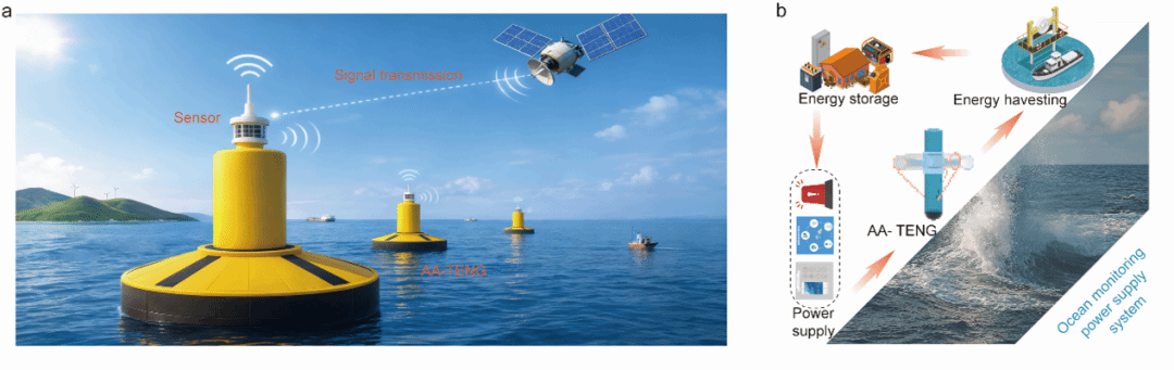 (a)AA-TENG的应用场景示意图;(b)AA-TENG的海洋自供电系统示意图;