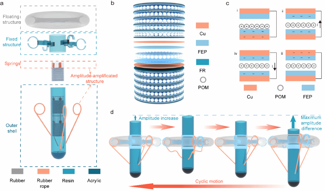 该工作结合流体激励、结构响应与摩擦电转换机理,提出了振幅放大结构摩擦纳米发电机(AA-TENG),增强了在低频波浪环境下的动力学响应能力,使系统能够在较弱波浪激励下获得更显著的运动位移和更高效的能量转换表现。其整体结构图如1a所示,其主要包括浮力结构,主体支撑结构,摩擦纳米发电单元,振幅放大结构。AA-TENG内部结构如图1b所示,核心摩擦材料为:POM球为正摩擦材料,FEP薄膜为负摩擦材料,波浪作用发生时,POM球在两层FEP薄膜之间做往复运动,POM球与FEP表面接触阶段,两种材料电子亲和力存在差异,电子从POM一侧转移到FEP表面,二者表面分别带有相反电荷,POM球离开FEP表面后,静电感应作用使电极之间形成电势差,驱动电子在外部电路中流动,产生电流,对应的电势转移图为图1c。该装置在海洋环境下的运动状态为图1d所示。AA-TENG 采用弹性预应力调节技术,实现了瞬时机械释放机制,使振幅最高可增加 300%,能量转换效率达到 51.2%。一个单元在波频率为1Hz时输出峰值功率 5.2毫瓦,而将体积扩大五倍后,峰值功率提高到52.48毫瓦,足以为低功率的海洋监测设备供电。