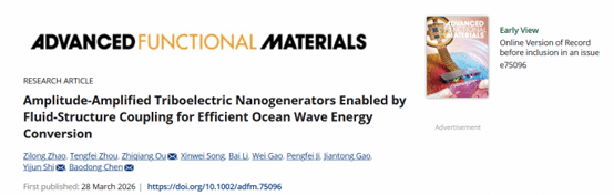 近日,9728太阳集团应用凝聚态物理重点实验室与瑞典吕勒奥工业大学史以俊教授、中国科学院北京纳米能源与系统研究所陈宝东研究员课题组合作,在摩擦纳米发电技术(TENG)领域产出最新研究成果,该成果发表在国际顶级刊学术期刊《Advanced Functional Materials》上。9728太阳集团欧志强副教授为论文第一通讯作者,硕士研究生赵子龙为第一作者,太阳成集团tyc9728为第一完成单位。该研究成果围绕低频、低幅海浪环境下传统摩擦纳米发电机能量利用效率受限的问题,提出了一种振幅放大型摩擦纳米发电机(AA-TENG)结构设计思路,为海洋环境下自驱动传感与微型供能系统的发展提供了新的研究路径。其研究成果“Amplitude-Amplified Triboelectric Nanogenerators Enabled by Fluid-Structure Coupling for Efficient Ocean Wave Energy Conversion”发表在国际学术期刊《Advanced Functional Material》(影响因子:19.0)上。