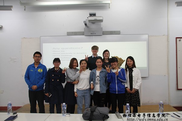 大会开始,孙咏萍副教授向大家介绍主讲人,代表同学们欢迎并感谢外国朋友的到来。接着,Natalie Mills以风趣幽默的风格,标准易懂的语言与我们分享有关美国文化,特别介绍美国的大学、传统节日、以及美国的婚礼等。她结合自己的亲生经历,加以丰富的讲义资料,给我们呈现出生动的美国文化特色。随后,同学们与外国朋友进行交流,向他们了解自己感兴趣的问题,在主讲Natalie Mills与外教Matt的认真解答下,同学们收获很多。大会最后,同学们为外国朋友送上精心准备的礼物,并合影留念,至此本次活动在一片欢乐的氛围下圆满结束。