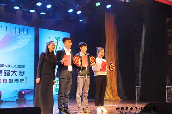 伴随着所有节目的全部结束,主持人宣布获奖单位和个人名单,我院团总支书记萨其尔老师作为学院代表上台接过第十五届“百灵杯”舞蹈大赛二等奖奖牌与最具人气奖,并且萨老师与塔林托亚老师还获得优秀指导老师奖项。在晚会结束后,我院党总支副书记何小龙老师与舞蹈演员们以及工作人员们亲切握手并合影留念表示祝贺。至此,第十五届“百灵杯”文艺汇演已全部结束。本次比赛荣获佳绩也显示出9728太阳集团对大学生文化艺术活动的支持力度,舞蹈演员们也始终秉承着为学院争光的态度,努力训练,不怕累不怕苦,他们的完美表现再一次向全校展示“物电”精神!